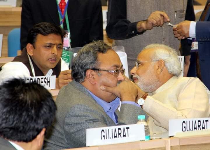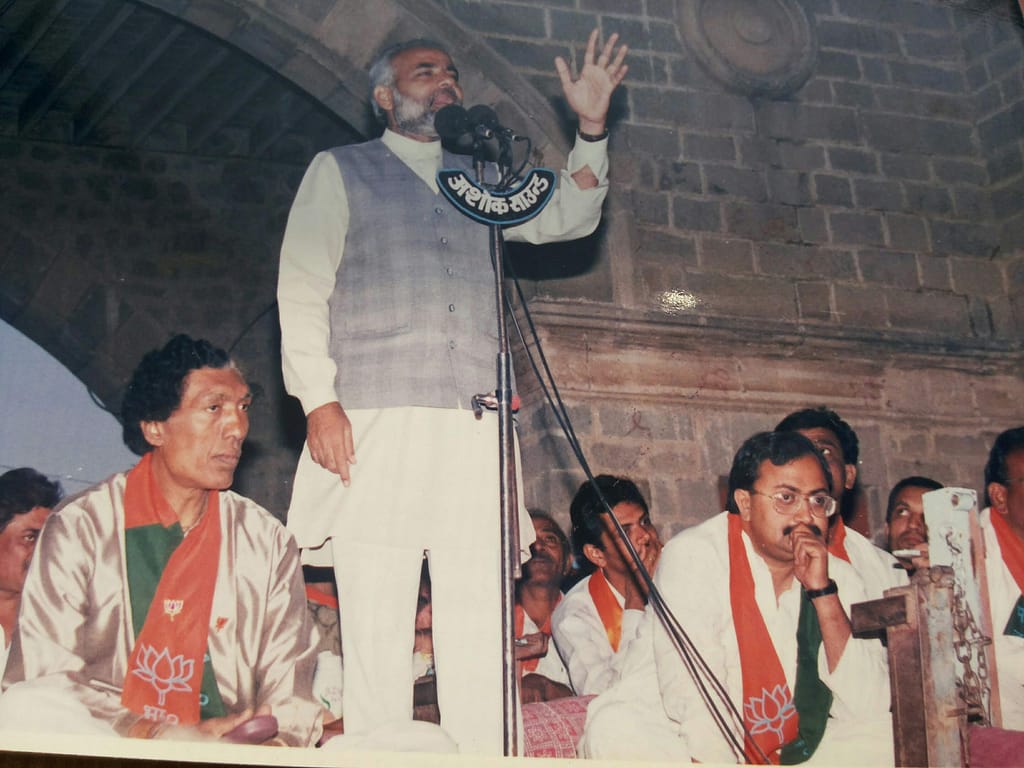 વર્ષ 2002ની ગુજરાત વિધાનસભા ચૂંટણી દરમિયાન વલભીપુર ખાતે યોજાયેલી જાહેરસભા પ્રસંગે નરેન્દ્રભાઈ મોદી સાથે — ખૂલી જીપમાં ઉમેદવાર સૌરભ પટેલ અને હું.