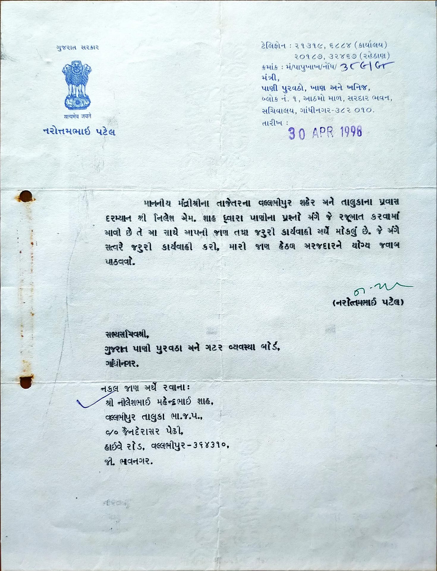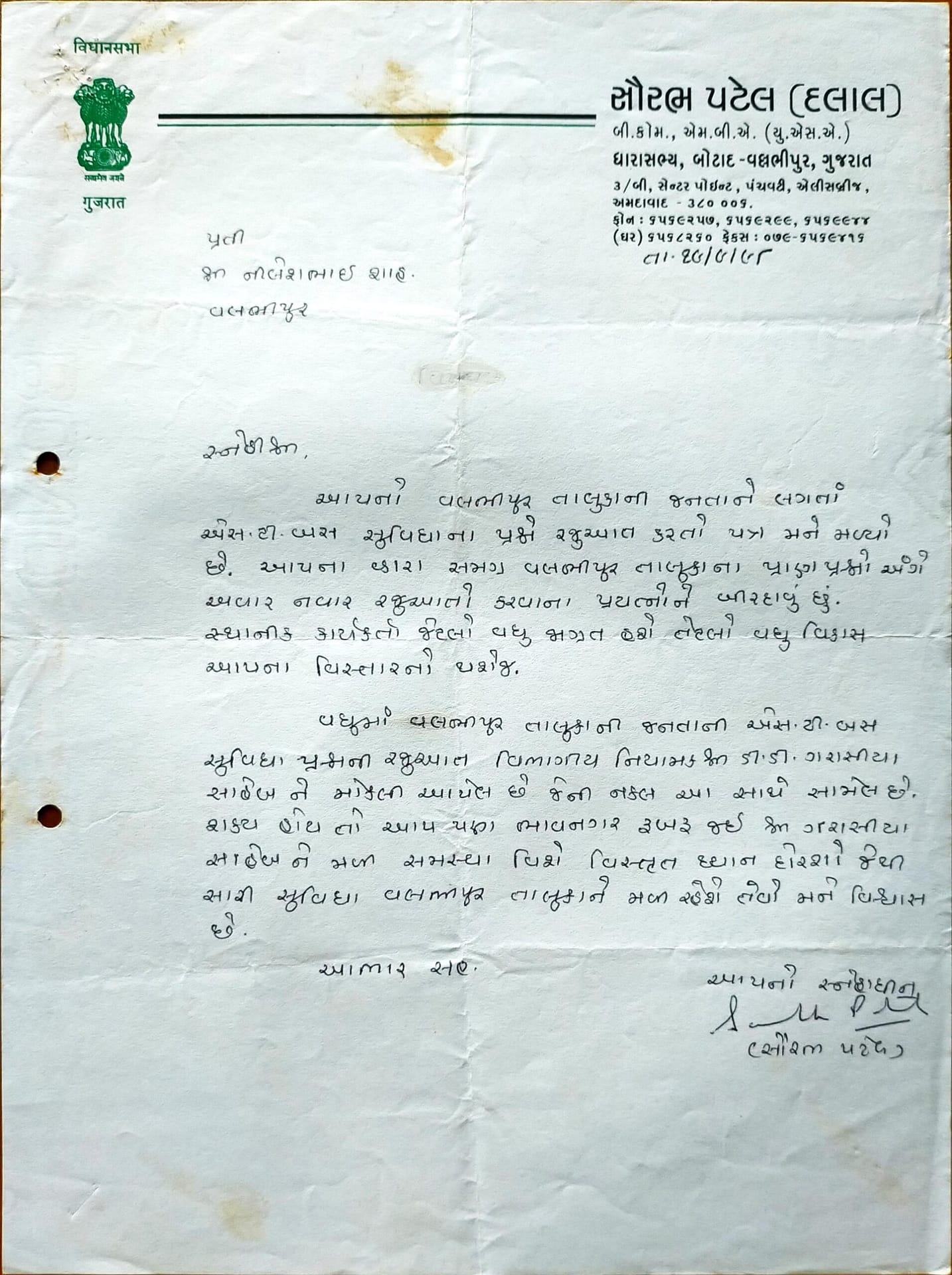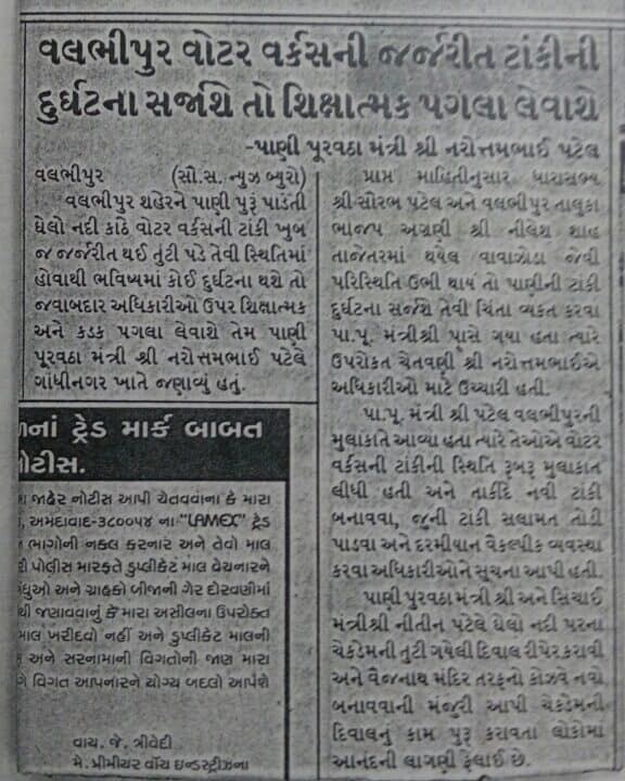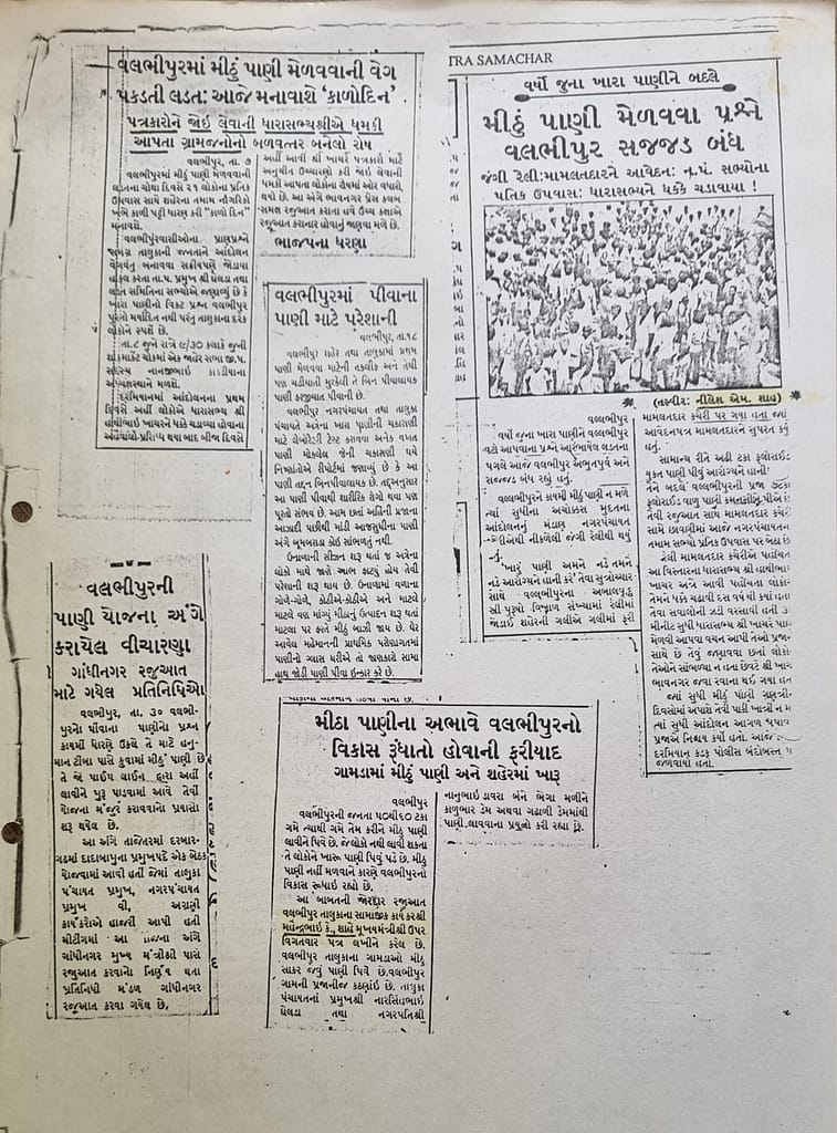 વલભીપુરમાં વર્ષો સુધી ખારું અને ફ્લોરાઈડયુક્ત પાણી લોકો માટે પ્રાણ પ્રશ્ન બની ગયું હતું. મારા દાદા, પિતાજી અને મેં આ સમસ્યાના નિરાકરણ માટે અનેક રજૂઆતો અને અરજીઓ કરી. અંતે 1989માં ગામના આગેવાનોના સહકાર સાથે અને વલભીપુર તાલુકા પ્રમુખ શ્રી નરસિંહ ઘેલડાની સાથે રહીને મેં મીઠું પાણી મેળવવા માટે સશક્ત આંદોલન કર્યું હતું.