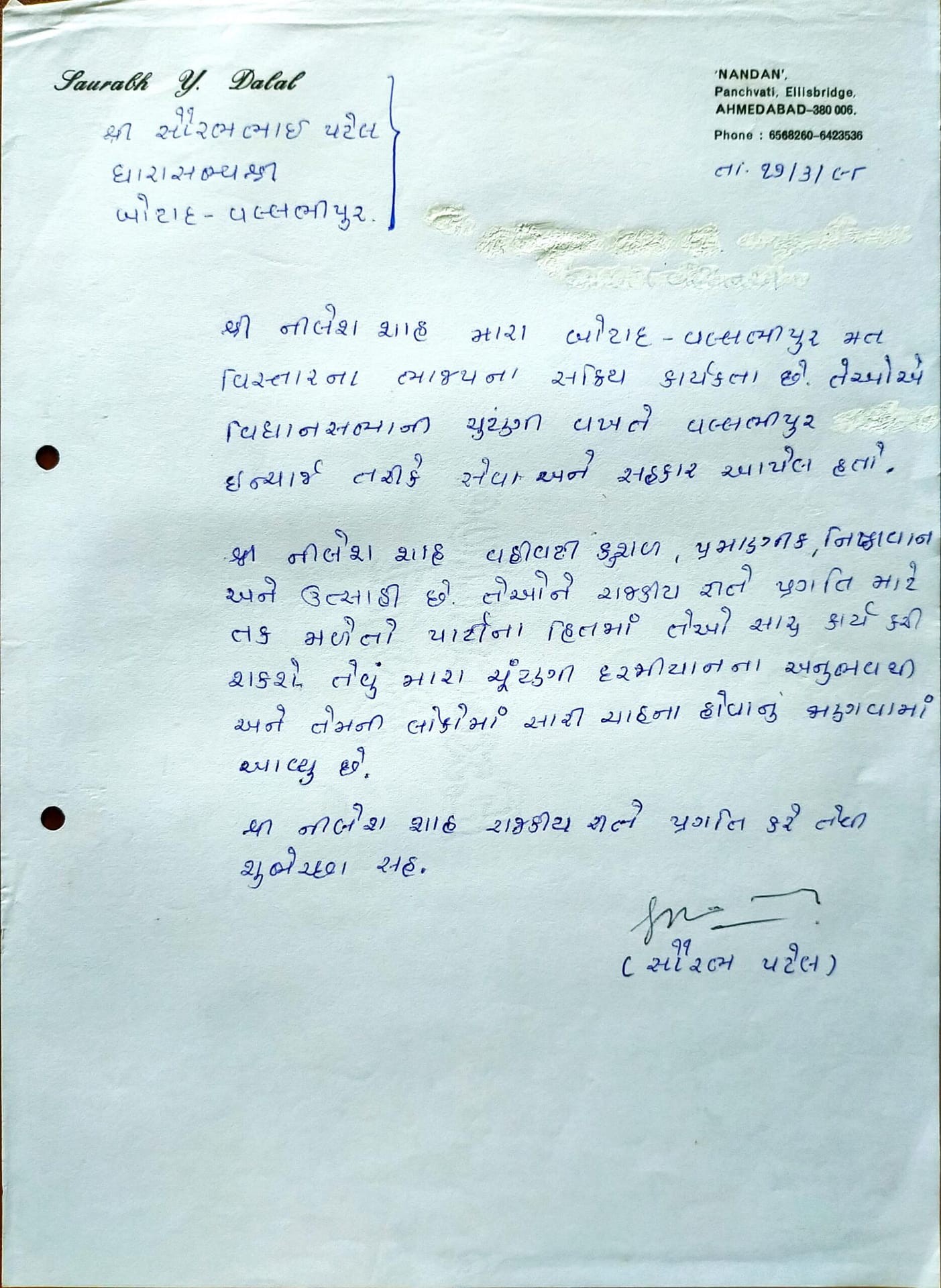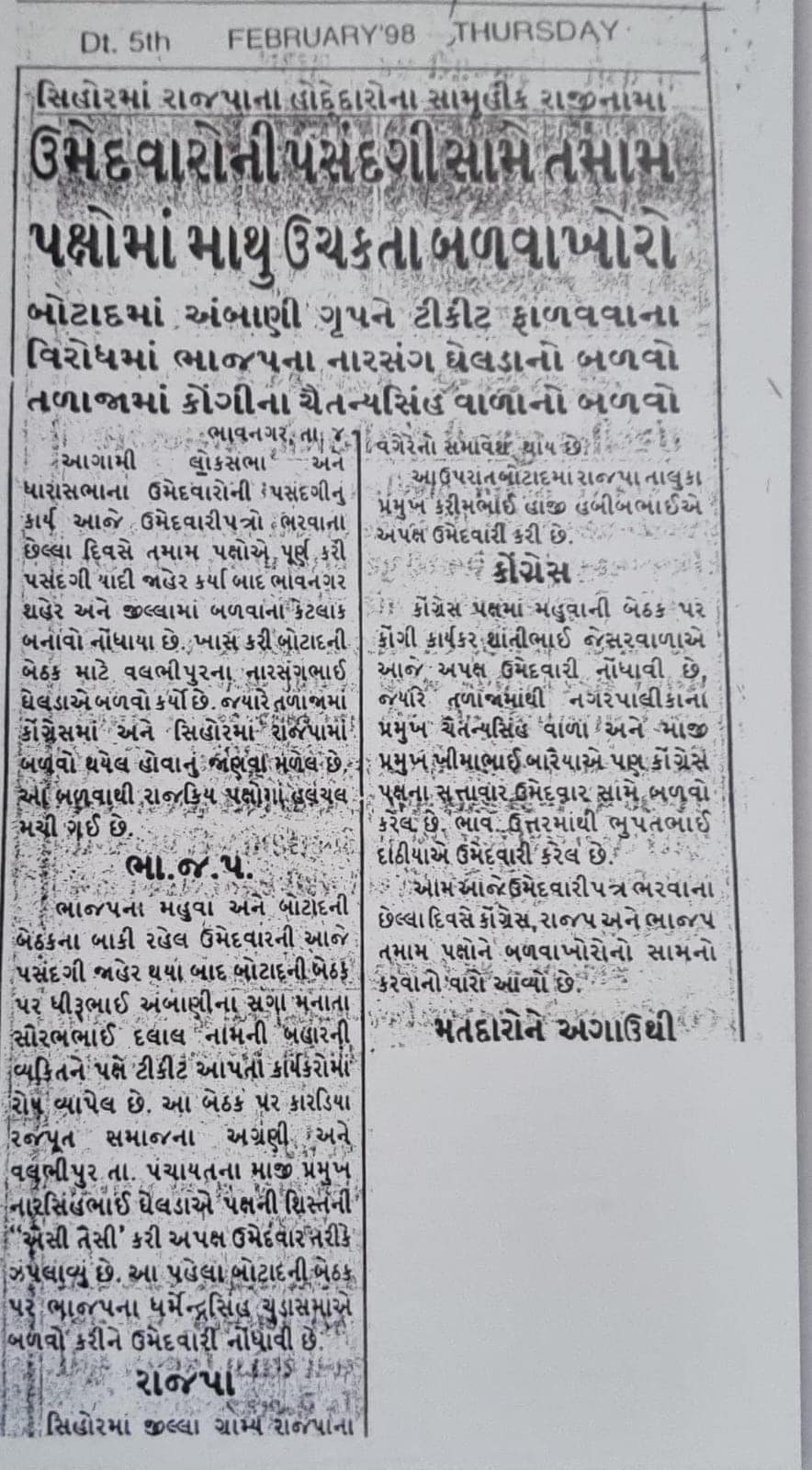 1998ની વિધાનસભા ચૂંટણી મારા રાજકીય જીવનનો મહત્વપૂર્ણ વળાંક બની. હું છ મહિના પહેલાં જ વલભીપુરને રામ-રામ કરીને મુંબઈ સ્થાયી થયો હતો. પરંતુ ચૂંટણી પ્રચાર માટે જ્યારે વલભીપુર પરત આવ્યો ત્યારે બોટાદ–વલભીપુર બેઠક પર સૌરભભાઈ પટેલ (દલાલ)ની ઉમેદવારી જાહેર થઈ ચૂકી હતી. આ વખતે વિધાનસભા અને લોકસભા બંને ચૂંટણી એક સાથે યોજાઈ રહી હતી.