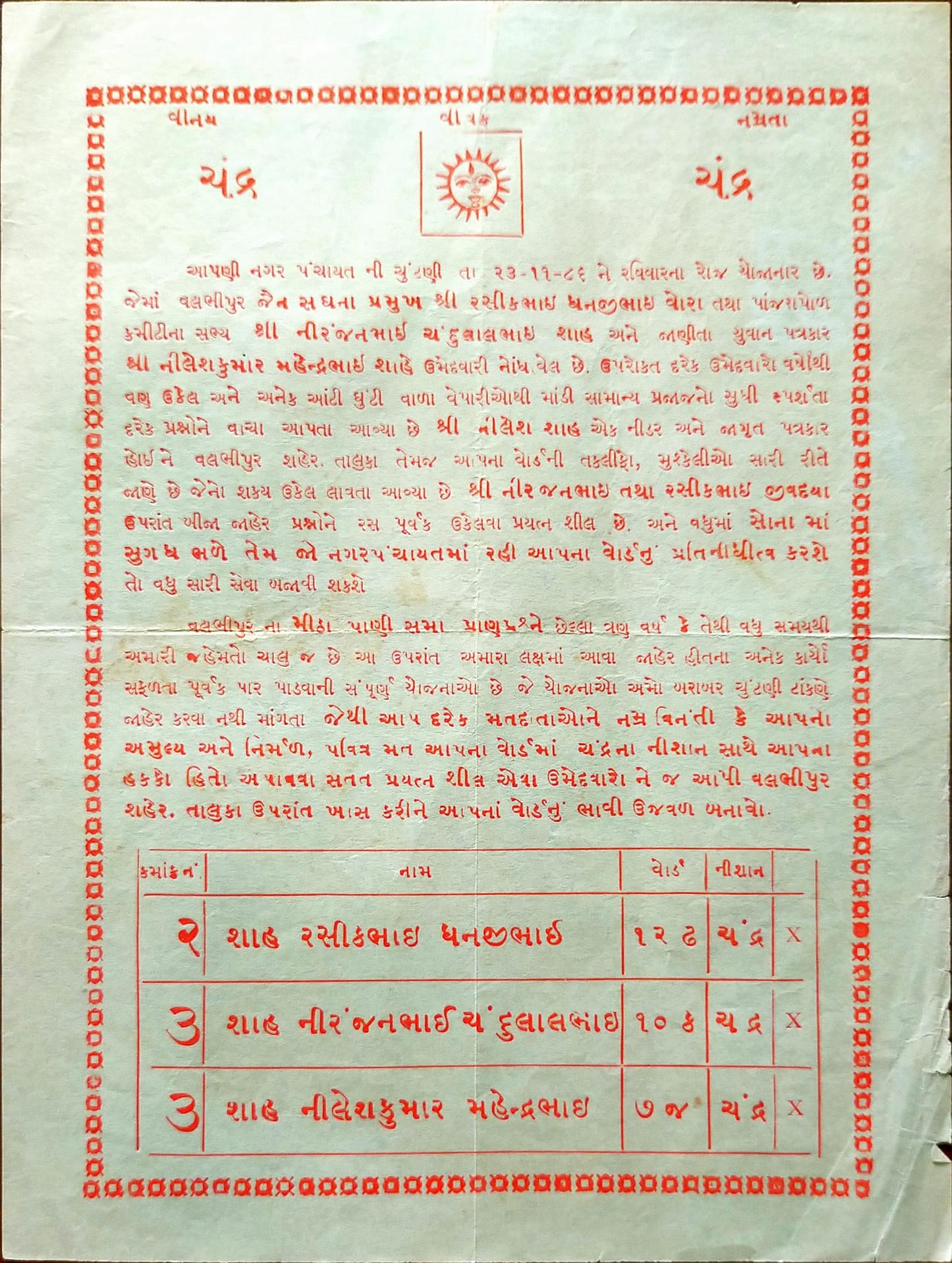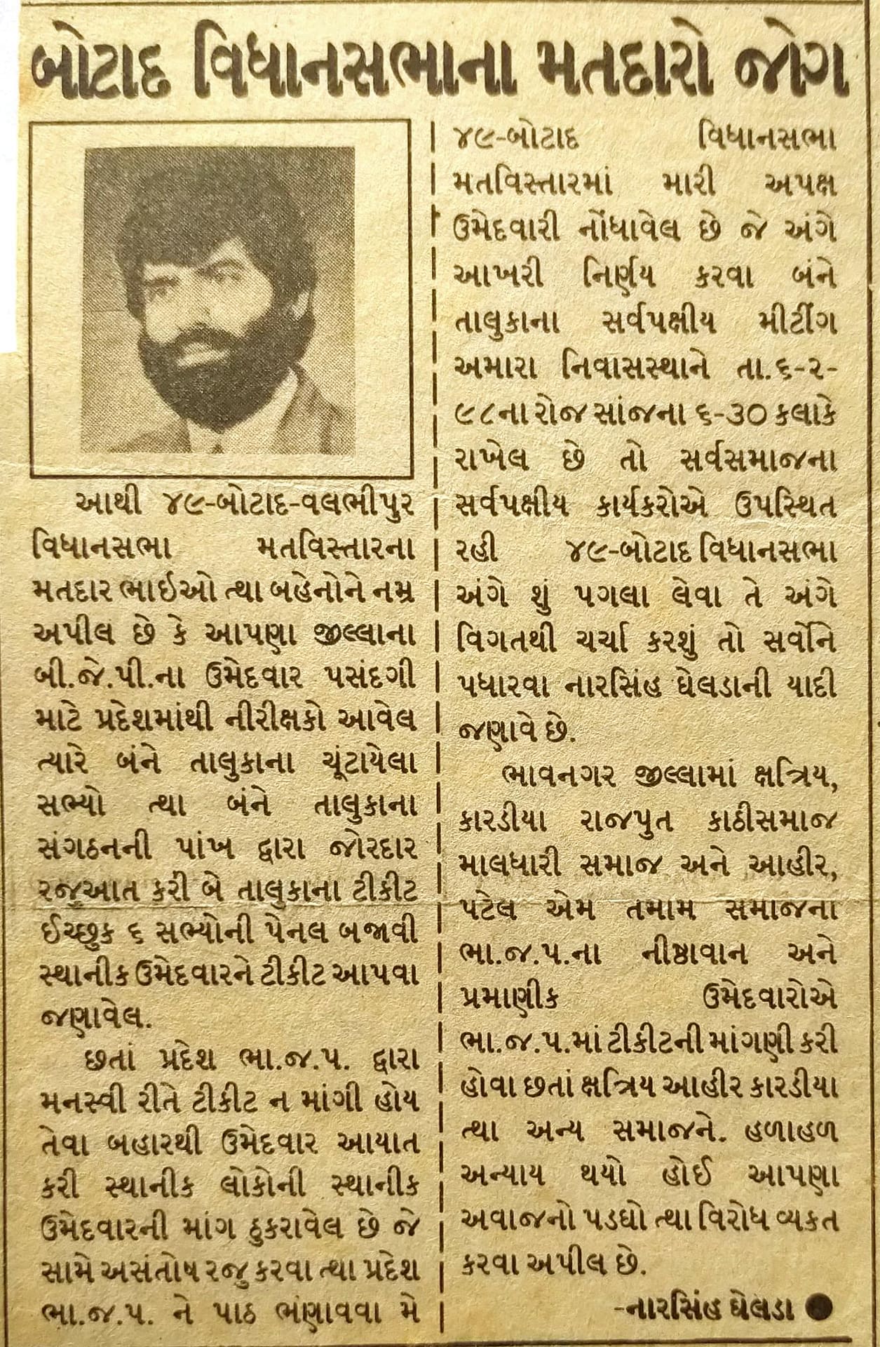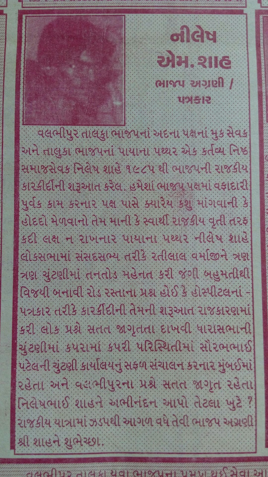 પછી આવ્યો 1984 નો સમય. દેશમાં ભાજપની સ્થાપનાને માંડ ચાર વર્ષ થયા હતા અને કોંગ્રેસનો સમગ્ર દેશમાં દબદબો હતો. એવા સમયમાં વલભીપુર તાલુકામાં ભાજપનો કેસરીયો લહેરાવવાનો સંકલ્પ અમે ચાર મિત્રોએ — ધર્મેન્દ્રસિંહ ચુડાસમા, કે. જી. પટેલ, શૈલેષ દવે અને મેં — લીધો. હું ત્યારે માંડ અઢાર વર્ષનો, સૌથી નાનો. એ પછી અમારા બીજા મિત્રો પણ જોડાયા.
