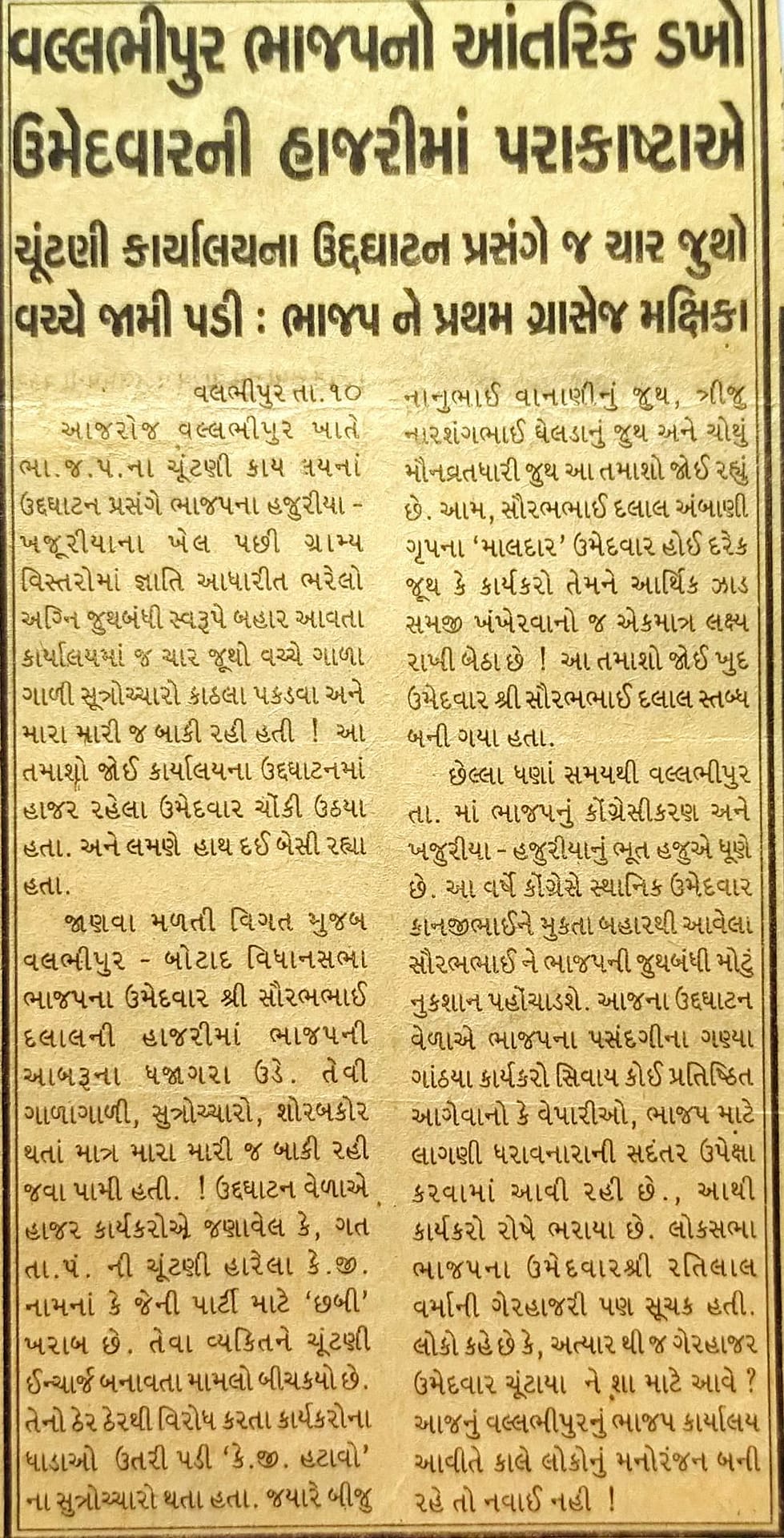સ્થાનિક સ્તરે અસંતોષનો માહોલ હતો. ચૂંટણી કાર્યાલય બંધ થઈ જવા સુધીની સ્થિતિ સર્જાઈ હતી. પરંતુ પક્ષશિસ્તને શિરોમાન્ય રાખીને અને આદરણીય રતીલાલ વર્માના માર્ગદર્શન હેઠળ મેં કાર્યકરો સાથે સંવાદ સાધ્યો, રોષ શાંત કર્યો અને બંધ કાર્યાલય ફરી શરૂ કરાવ્યું.