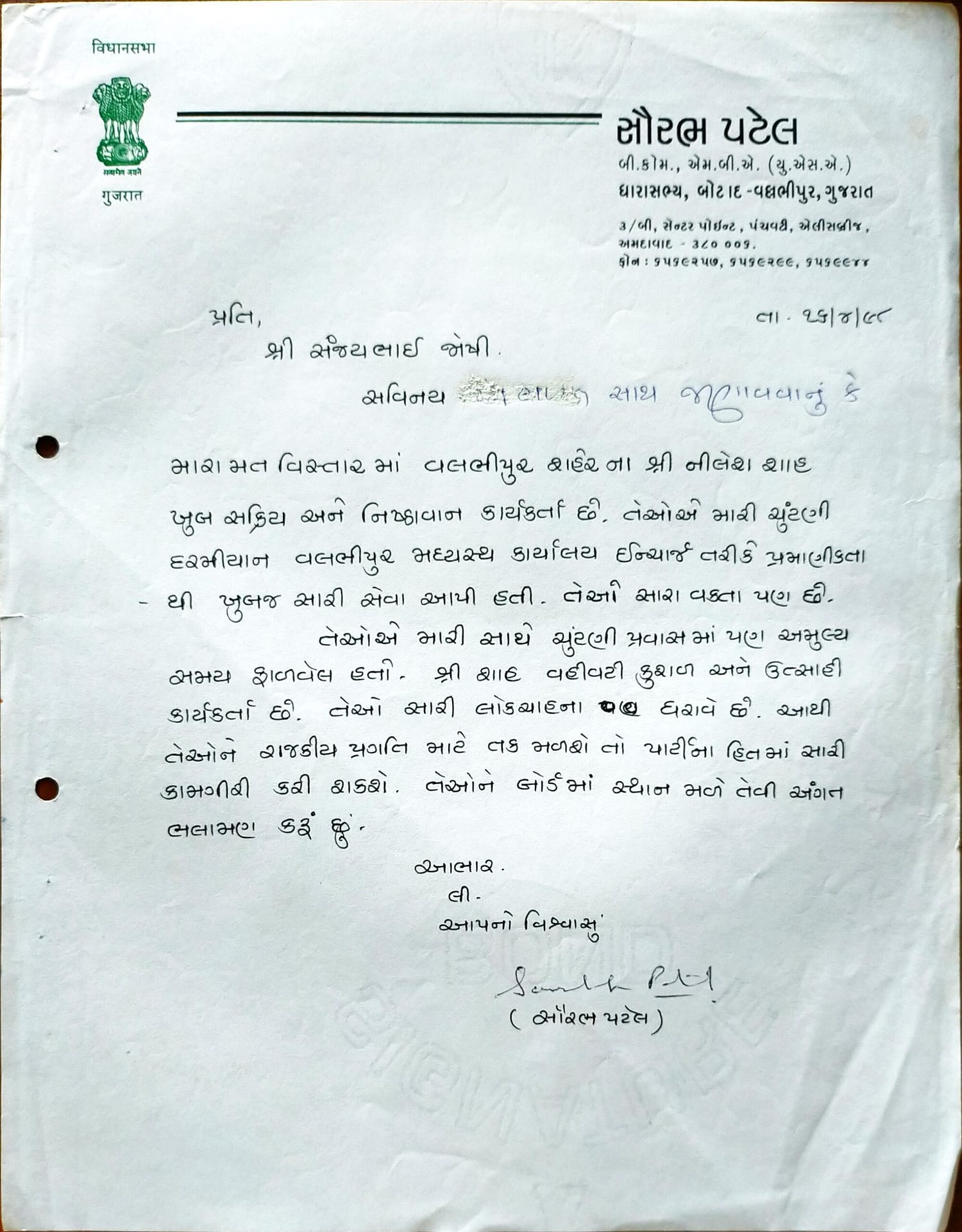 પક્ષના સારા દિવસો આવ્યા અને વિધાનસભામાં પહેલી વખત સત્તા પ્રાપ્ત થઈ ત્યારે સ્વાભાવિક રીતે જ મનમાં વિચાર આવ્યો કે પાયાના કાર્યકરને પણ સેવા માટે યોગ્ય અવસર મળવો જોઈએ. તેથી ચૂંટણી પછી મેં સૌરભભાઈ સમક્ષ વિનમ્રતાપૂર્વક રજૂઆત કરી કે ગુજરાત સરકારના કોઈ બોર્ડ-નિગમમાં સેવા કરવાનો અવસર મળે તો સારું.