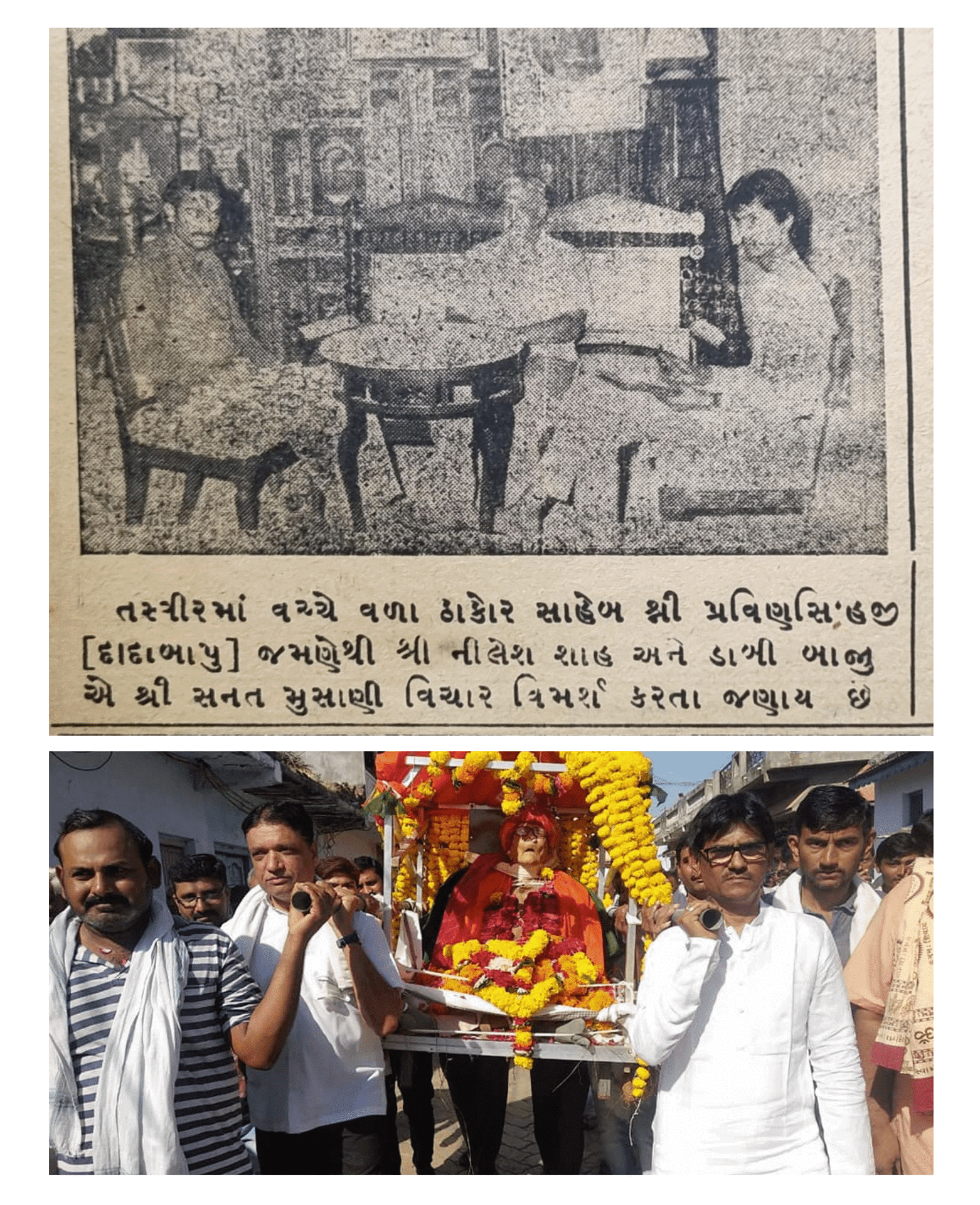 ઐતિહાસિક પળોનું સંકલન: (ઉપર) જંગી જનમેદનીને સંબોધી રહેલા ધારાસભ્ય શ્રી પ્રવિણસિંહજી (દાદાબાપુ). (નીચે ડાબે) વલભીપુર રાજમહેલમાં આંતરરાષ્ટ્રીય જૈન સંત પૂ. શ્રી ચિત્રભાનુ મહારાજ સાથે ભક્તિભાવમાં મગ્ન દાદાબાપુ અને તેમની પાછળ આદરભાવ સાથે ઊભેલા મારા પિતાશ્રી મહેન્દ્રભાઈ કે. શાહ.