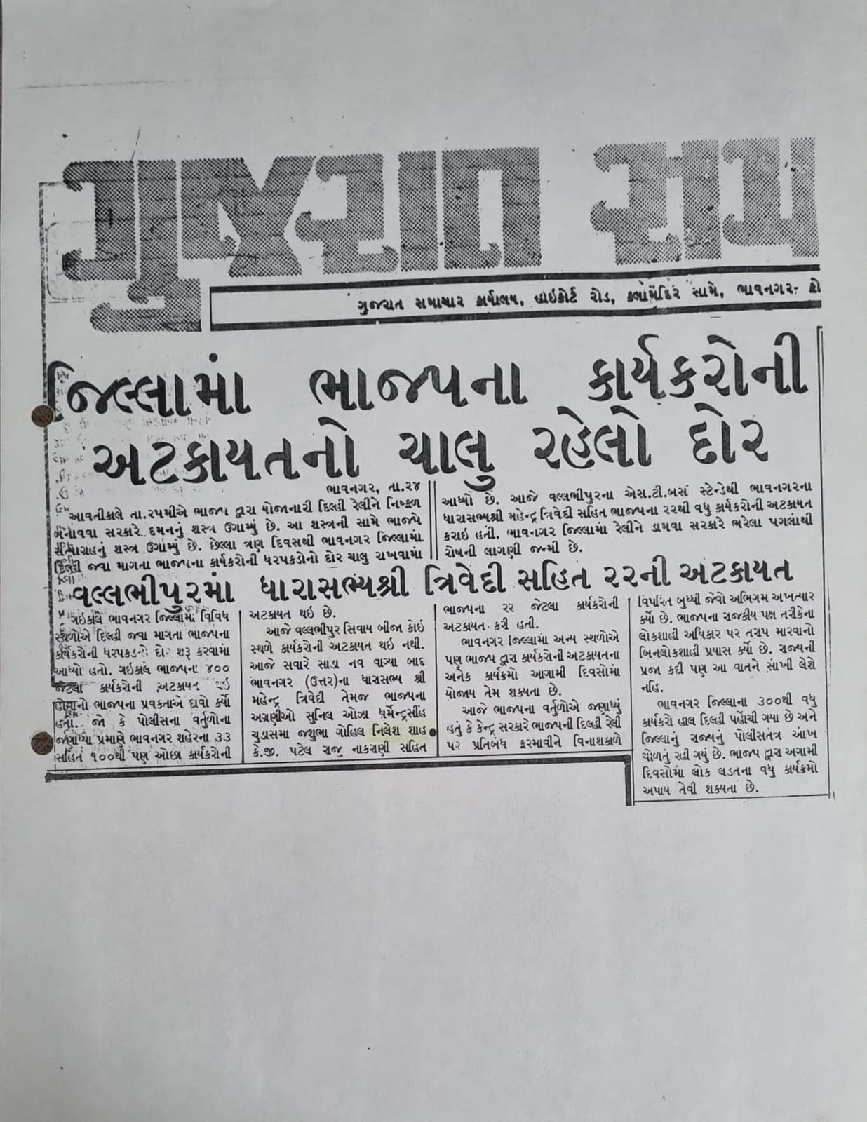 જ્યારે ભાજપની દિલ્હી રેલીને રોકવા સરકારે દમન ગુજાર્યું હતું. શ્રી બુદ્ધેશ્વર મહાદેવના દર્શન કરી દિલ્હી જવા રવાના થતી વખતે વલ્લભીપુર એસ.ટી. બસ સ્ટેન્ડેથી ધારાસભ્ય શ્રી મહેન્દ્રભાઈ ત્રિવેદી સાથે મારી (નીલેશ શાહ) અને અન્ય સાથી કાર્યકરોની ધરપકડ કરવામાં આવી હતી.