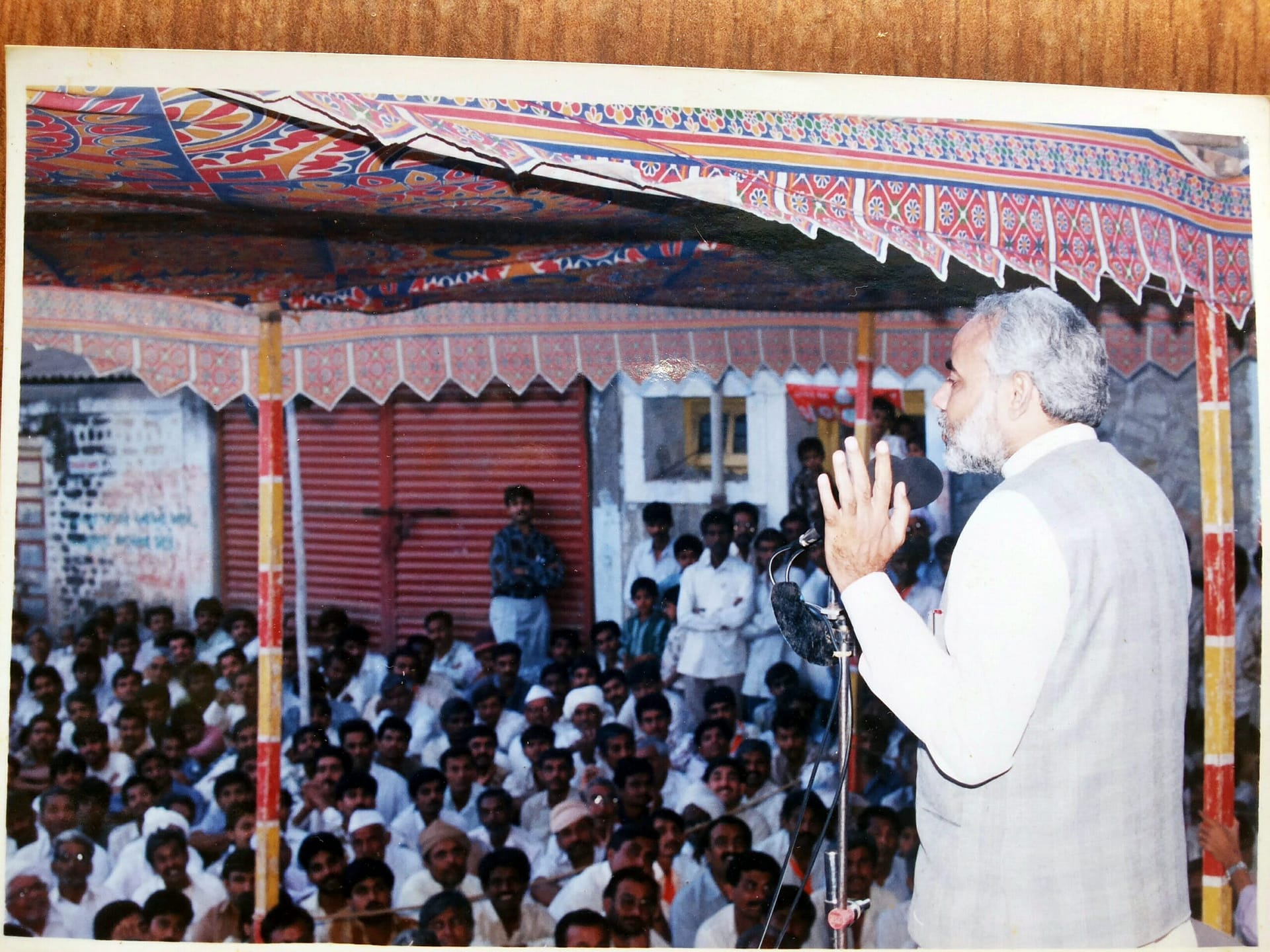 વર્ષ 2002ની ગુજરાત વિધાનસભા ચૂંટણી દરમિયાન વલભીપુર ખાતે યોજાયેલી જાહેરસભા પ્રસંગે નરેન્દ્રભાઈ મોદી સાથે — ખૂલી જીપમાં ઉમેદવાર સૌરભ પટેલ અને હું.